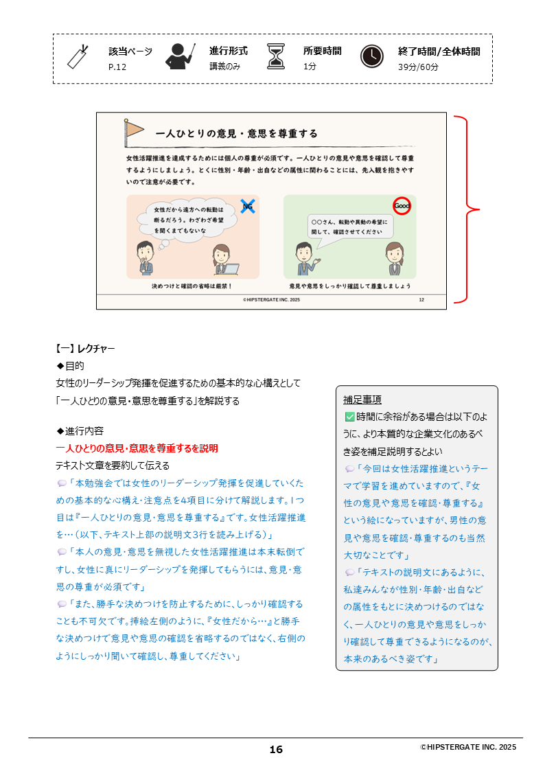 「なぜ女性が力を発揮しづらい場面が生まれるのか」「気づかない思い込みが女性のリーダーシップを阻害していないか」――そんな身近な疑問から学びを始めてみませんか? テキストでは、女性のリーダーシップを妨げている要因を整理し、チーム・組織で職場を改善していく視点と方法を解説しています。誰かが無理をすることなく、働きやすく成果の出る職場をつくるための気づきが得られる内容となっています。まだまだ改善の余地がある職場の「女性活躍推進」について、“リーダーシップ”を切り口に勉強会を開催してみてはいかがでしょうか。
